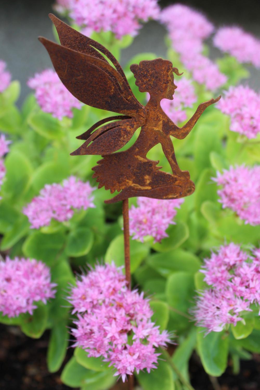 En trevlig trädgårdsprynad i rost från Lind Decoration föreställande en Älva med dubbla vingar. Sprider glädje i trädgården. Går även utmärkt att ha i större krukor även inomhus.