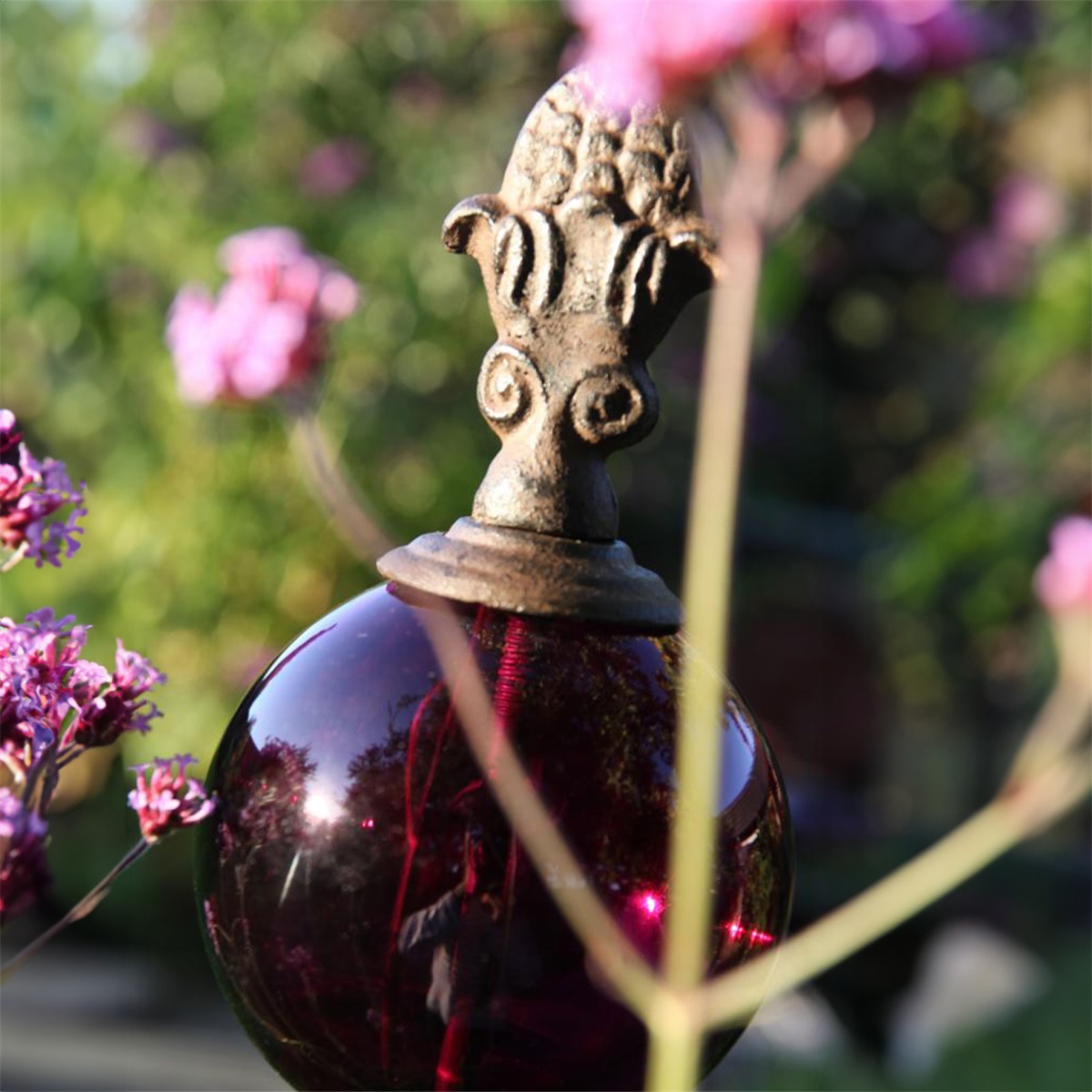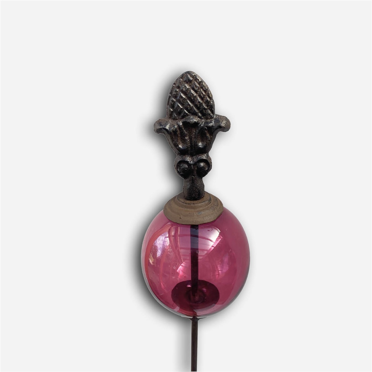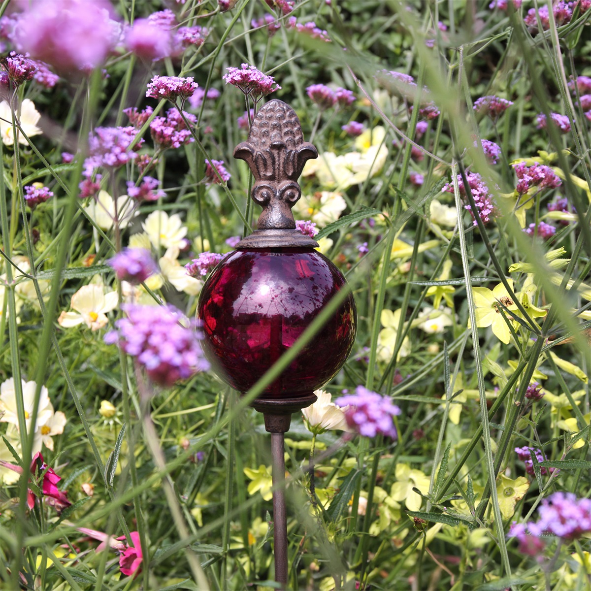 Den färgade glaskulan skapar ett levande och gnistrande uttryck i rabatten eller krukan och förändras med ljuset under dagen. Inspirerad av naturens former kombinerar den rustik metall med elegant glas för en unik balans mellan det naturliga och det dekorativa.