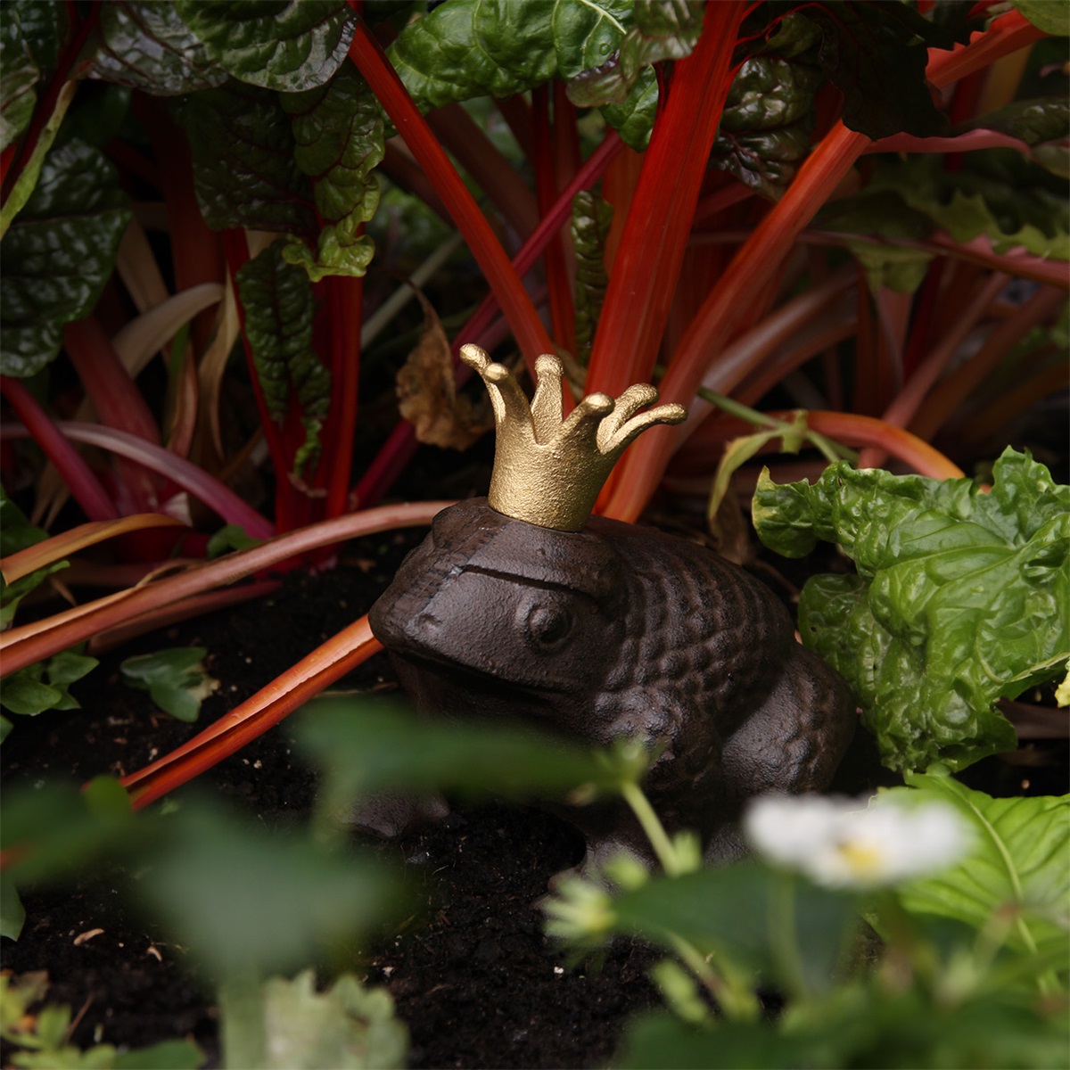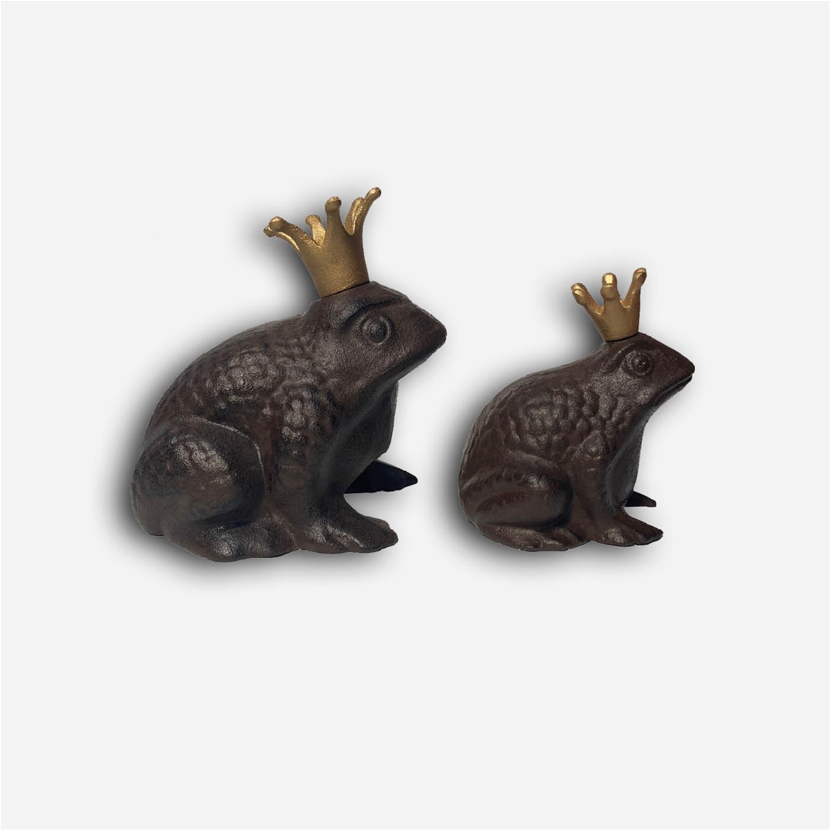 Strandgroda i gjutjärn från ELDgarden med guldkrona. En charmig och tung trädgårdsdekoration i två storlekar för rabatt, entré eller uteplats.