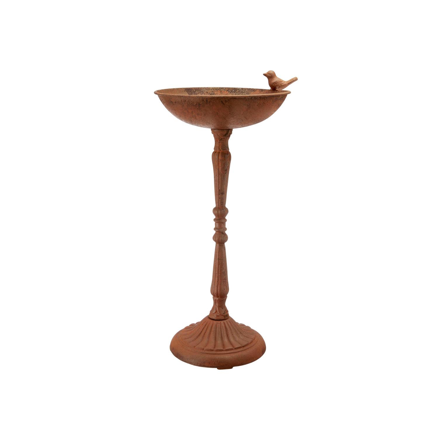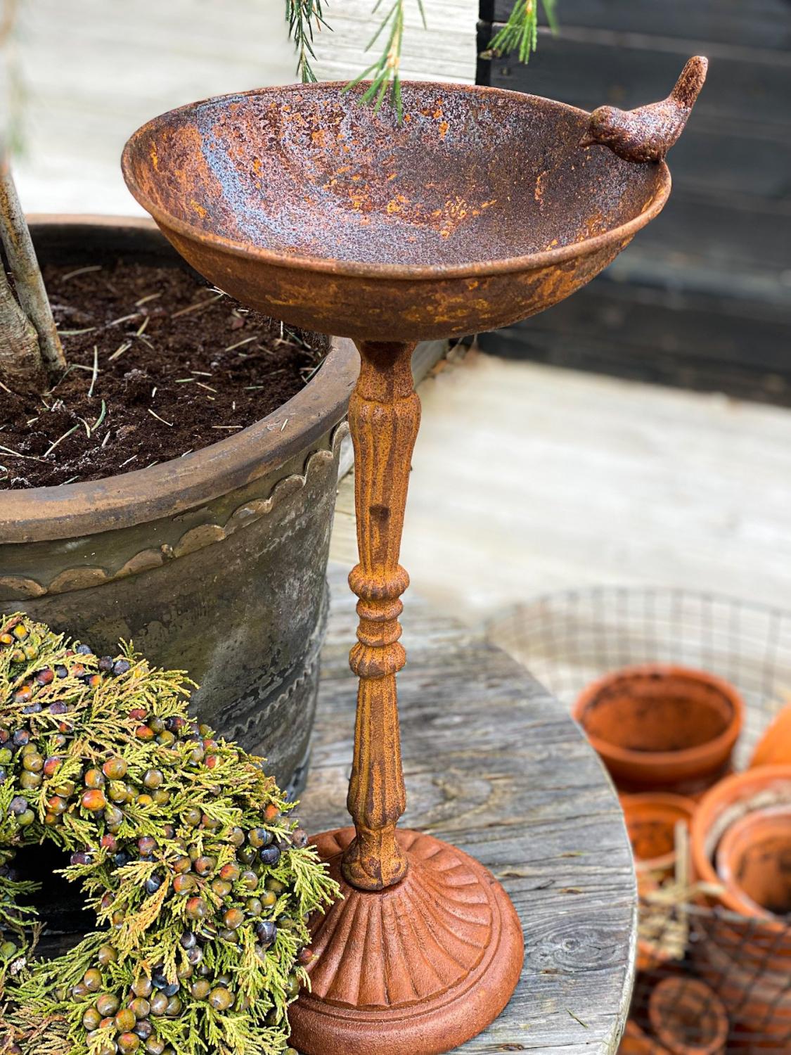Ett nytt fågelbad på fot i rostig plåt för trädgården från Wikholmform. Robust konstruktion med vikt på 2,4 kg. står stabilt på marken.