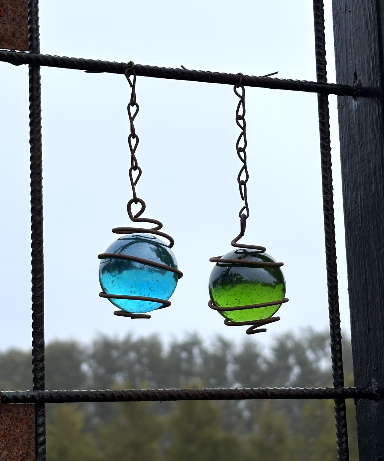 Dekorativa glaskulor i set om 2 stycken, designade för att hängas i armeringsnät. Kulorna är omslutna av en rustik metalltråd och hängs enkelt upp för att skapa ett levande och stilfullt blickfång i trädgården.
