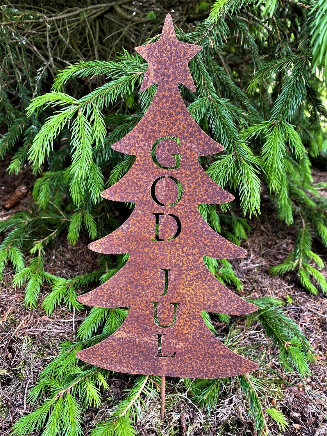 Trädgårddekoration rost i form av en gran med text god jul. Så trevlig att dekorera med tex i krukan på trappan, i rabatten, i kruka inomhus mm
