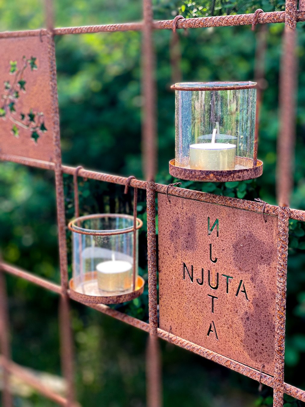 Hängande värmeljushållare till armeringsnät från Lind Decoration. Hållaren med värmeljusglas hänger bra i ett armeringsnät med rutor på 15 x 15 cm eller större. Fint att kombinera ihop med skyltar från Lind Decoration.