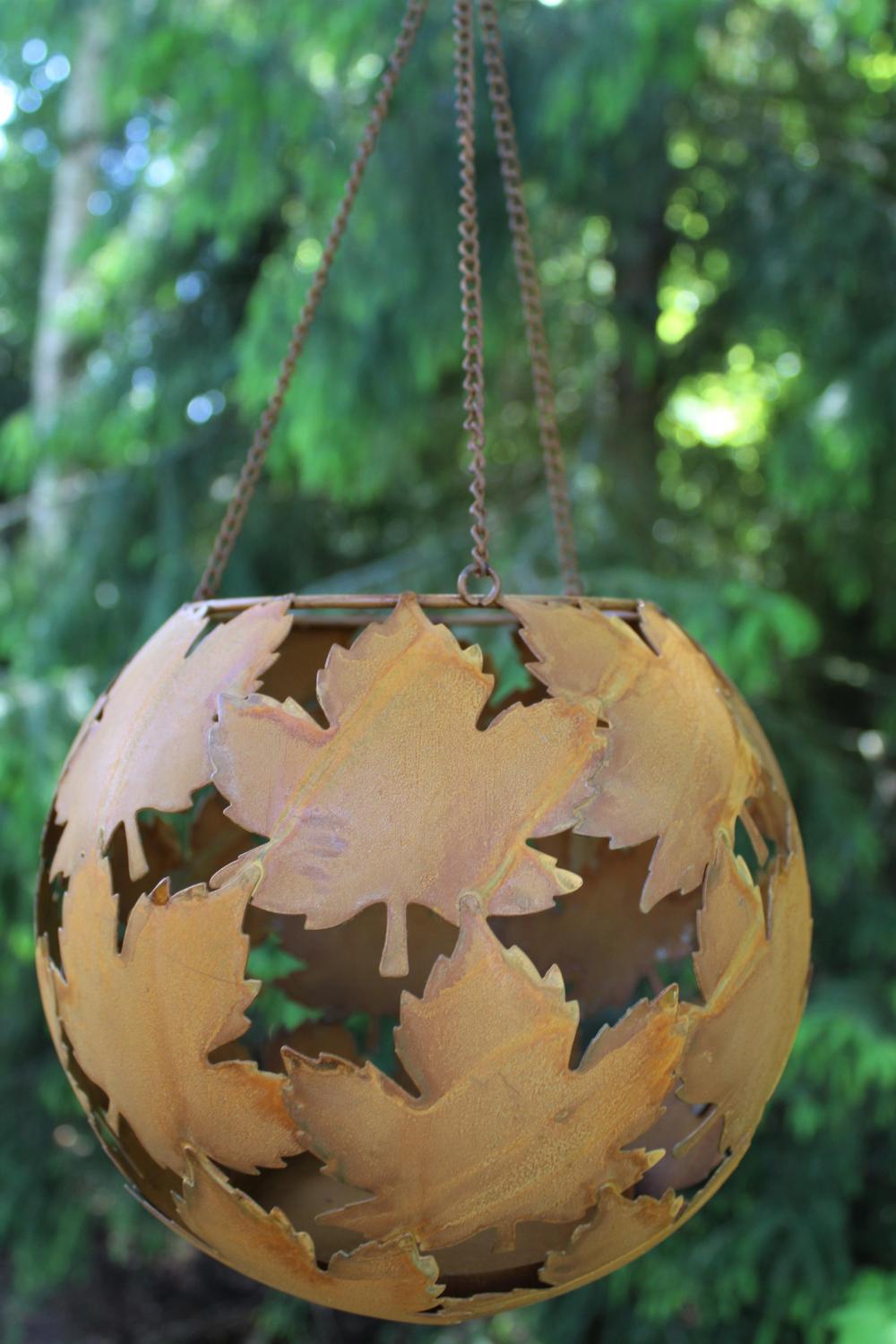 Trevligt hängande rostigt lönnklot med hållare i botten för tex marschall eller blomma. Fungerar därför både som marschallhållare och ampel.