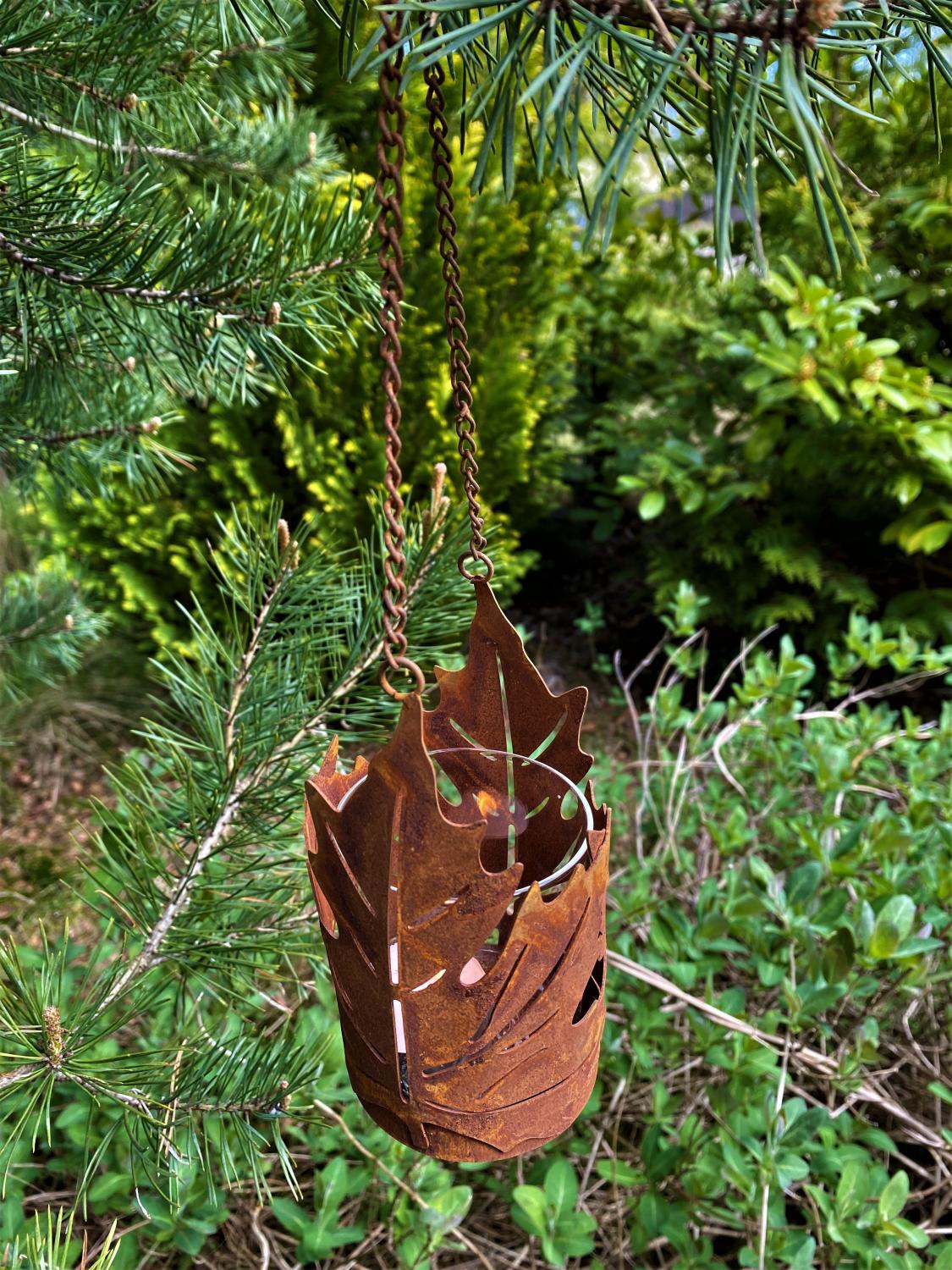 Hängande lönnlykta i rost från Lind decoration. Snygg design som kan hängas ute för en mysig belysning. Glas medföljer för värmeljus.