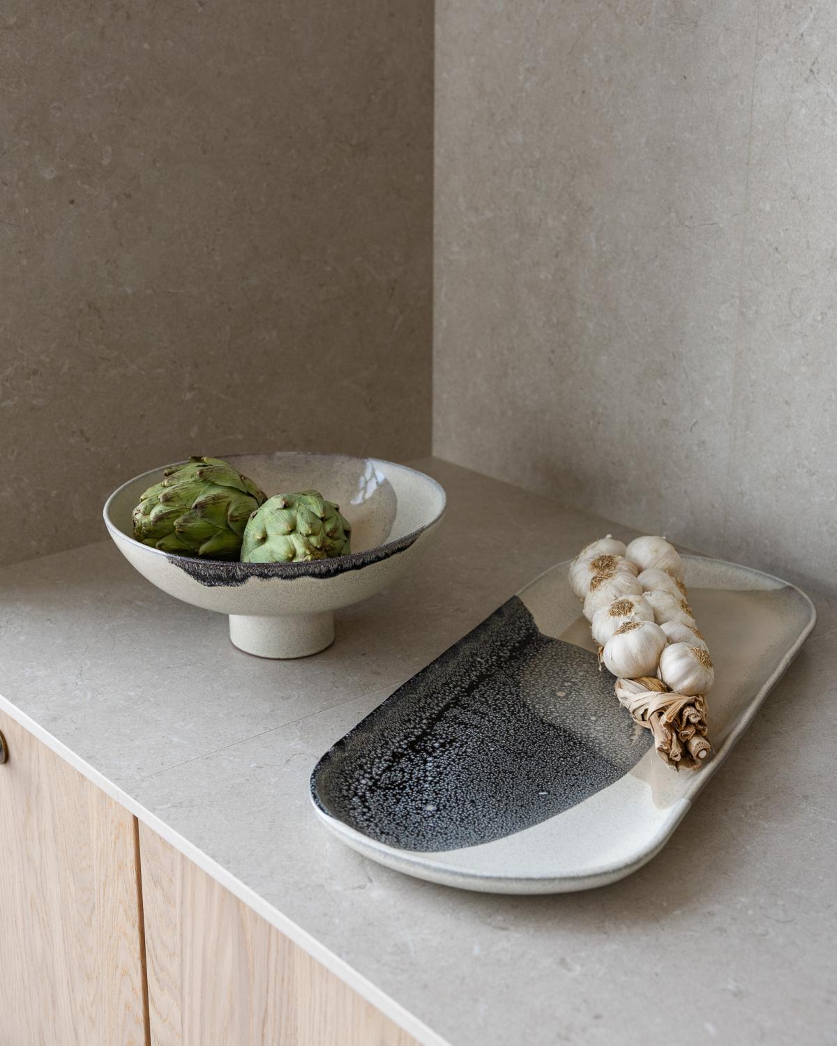 Handgjort fat, tillverkat i Portugal. Ett stiligt fat som passar perfekt för att skapa en dekorativ ljusuppsättning eller servera chark och snacks. Den enkla men eleganta designen gör fatet också fint att ha framme som en dekorativ detalj.