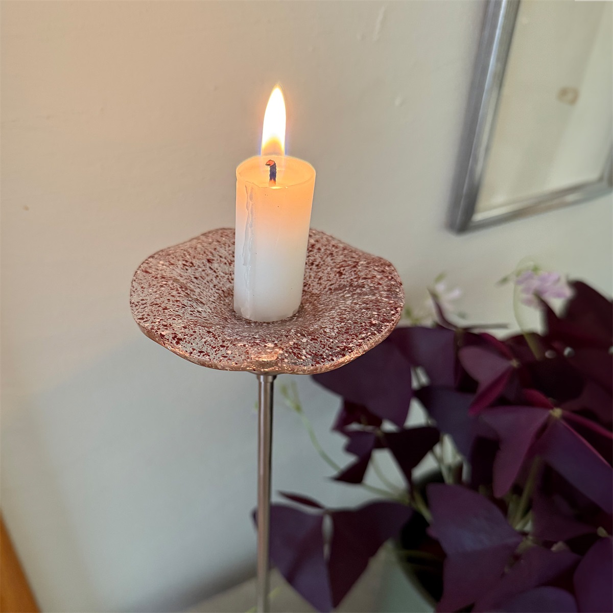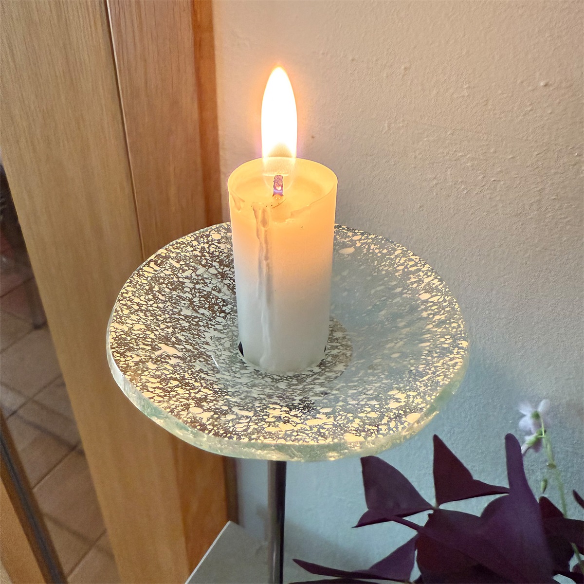 En lätt och lekfull ljusmanschett i glas för kronljus, dekorerad med små färgstänk i mjuka toner. Fångar ljuset fint och ger din ljusstake en personlig detalj. Nyhet från ELDgarden