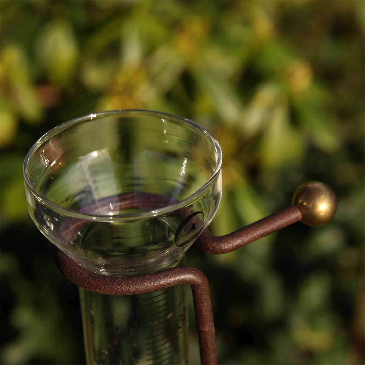 En regnmätare samlar upp nederbörd i ett graderat glas så att du enkelt kan avläsa hur många millimeter regn som fallit.