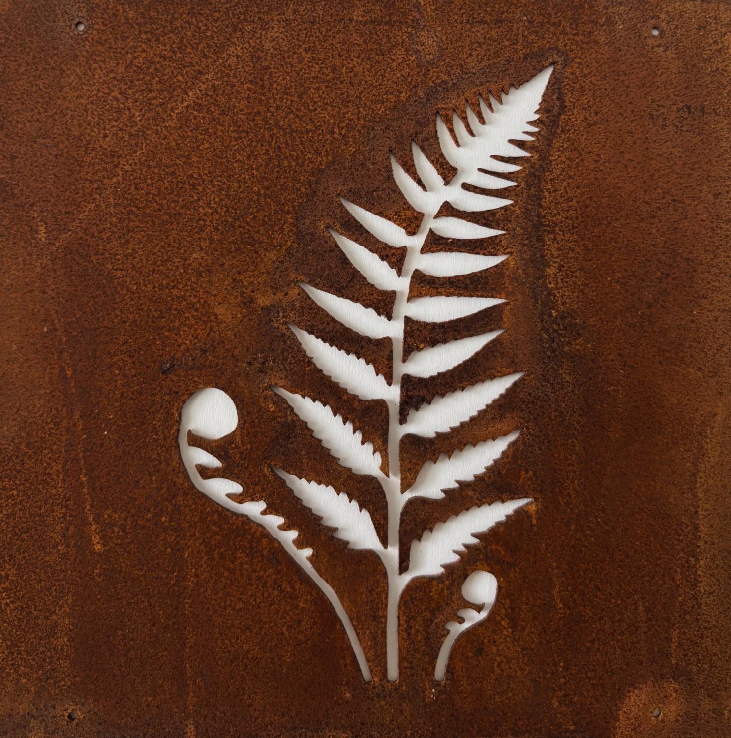 Dekorativ skylt i rostig metall med ett utstansat motiv av en ormbunke som skapar en känsla av frodig trädgården. En stilfull detalj som ger din trädgård en personlig och levande känsla. Skylten är anpassad för armeringsnät med maskstorlek 15 x 15 cm och fästs enkelt med medföljande ståltråd.