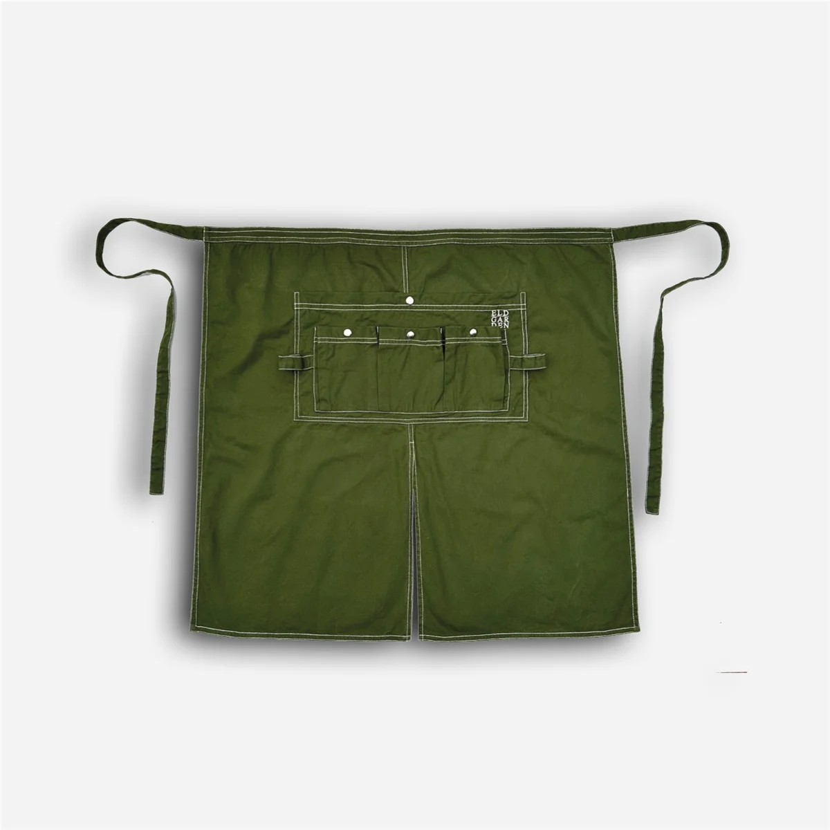 ytt medellångt förkläde från ELDgarden i trendfärgen grön. Förklädet har tre små fickor och en stor ficka med tryckknapp, samt två hällor som är praktiska att hänga sekatören i.