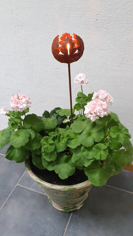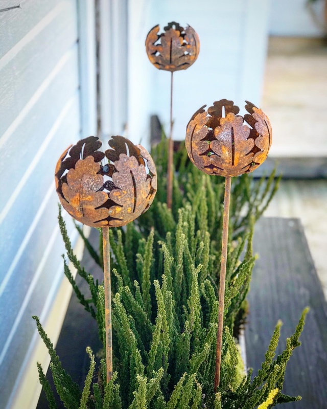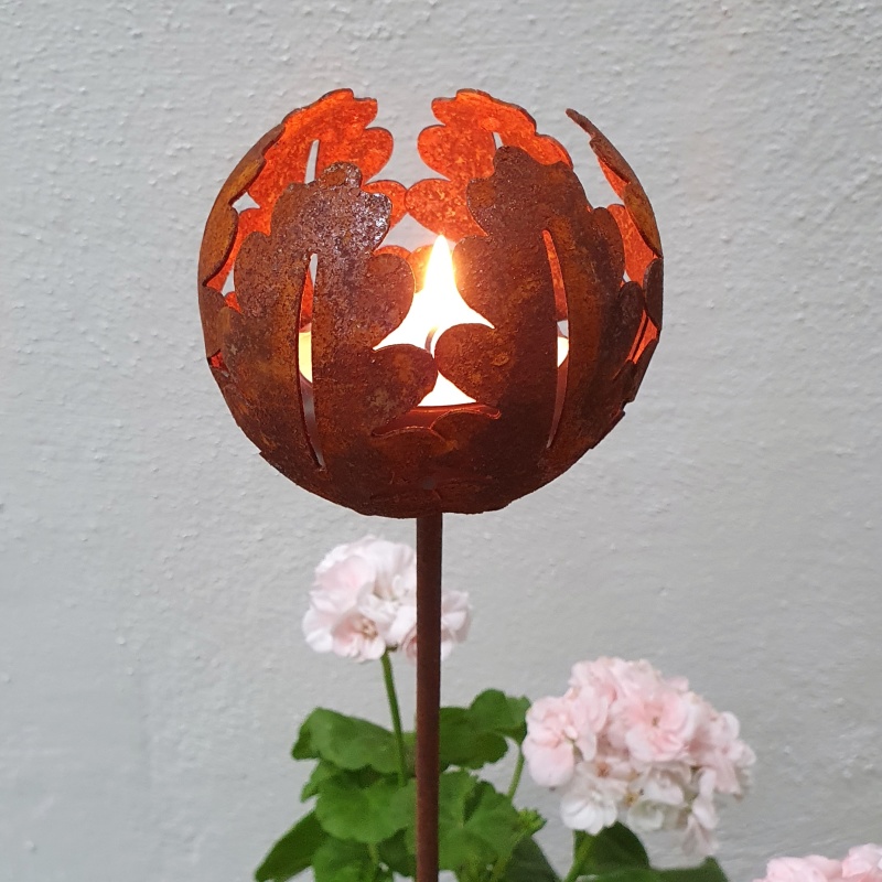 Elegant hållare för värmeljus på pinne från ELDgarden i form av ekblad i rostig plåt. Värmeljushållaren ger en mysig inramning i trädgården, balkongen eller inomhus i en stor kruka. Utgör också en en fin trädgårdsdekoration.
