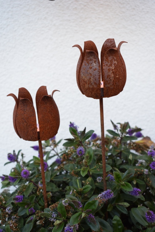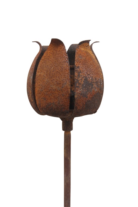 Elegant värmeljushållare på pinne från ELDgarden i form av en ros i rostig plåt. Värmeljushållaren ger en mysig inramning i trädgården, balkongen eller inomhus i en stor kruka. Utgör också en en fin trädgårddekoration.